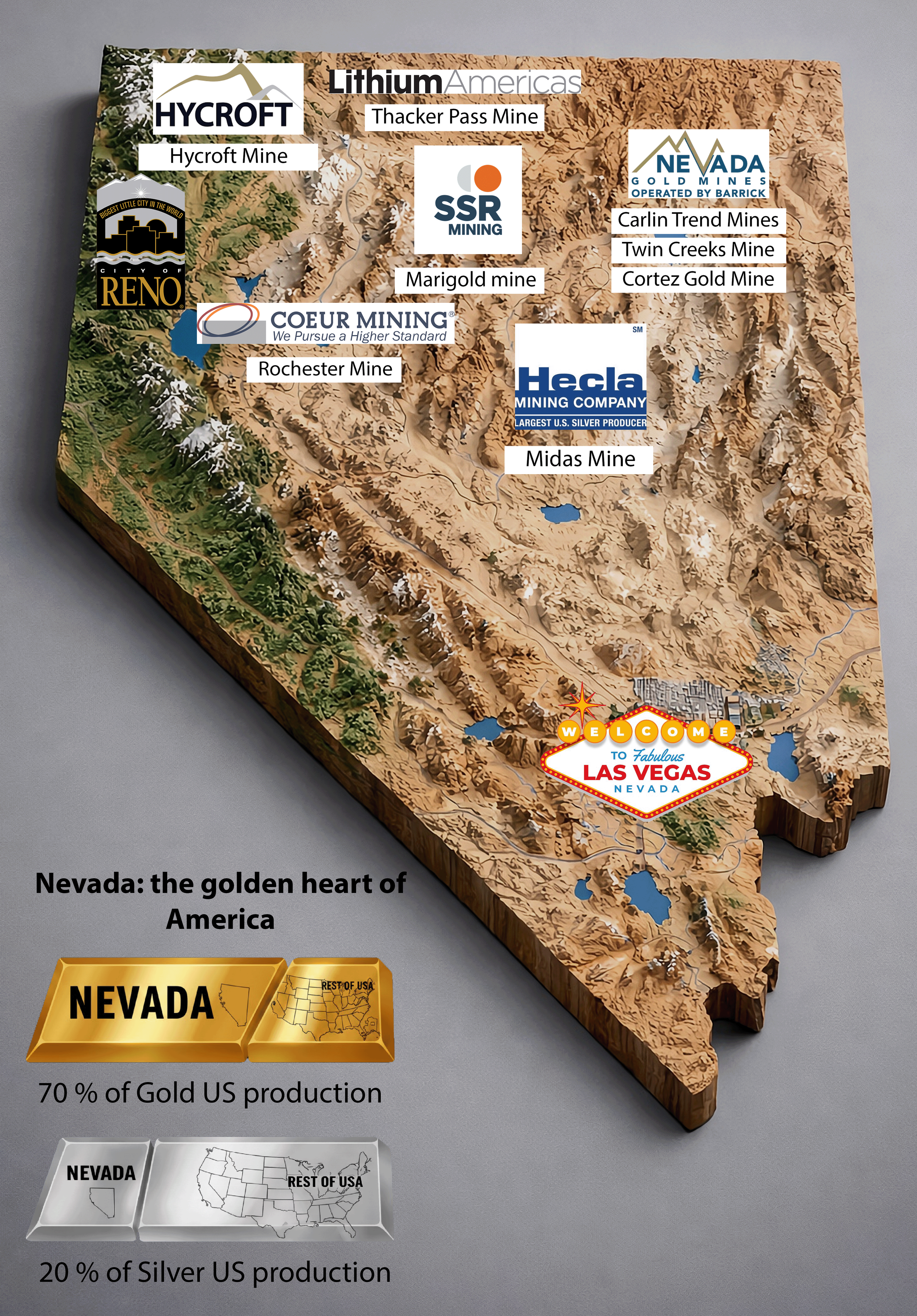 Hycroft is located in Nevada the No 1 US state for mining which produces ~ 70% of all US gold and about 20% of its silver. Within 200 miles of Hycroft are the most valuable gold mines in the United States: Barrick and Newmont’s Nevada Gold Mines Joint Venture Mines, SSR Mining, Hecla and Couer are all in Nevada.